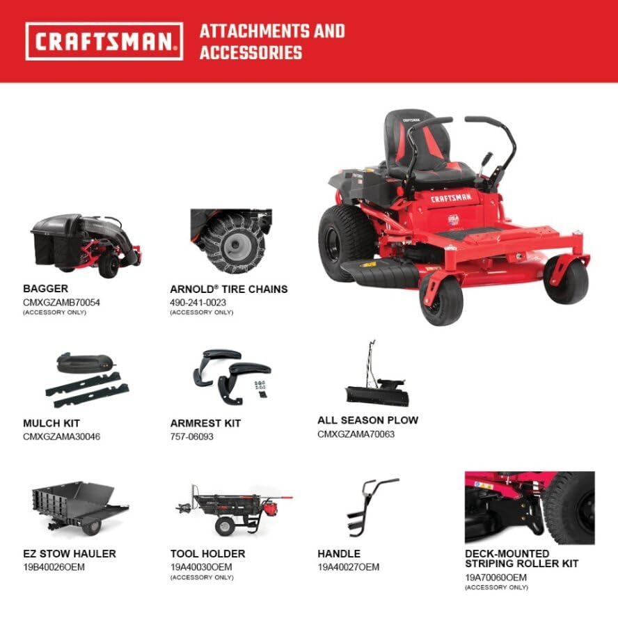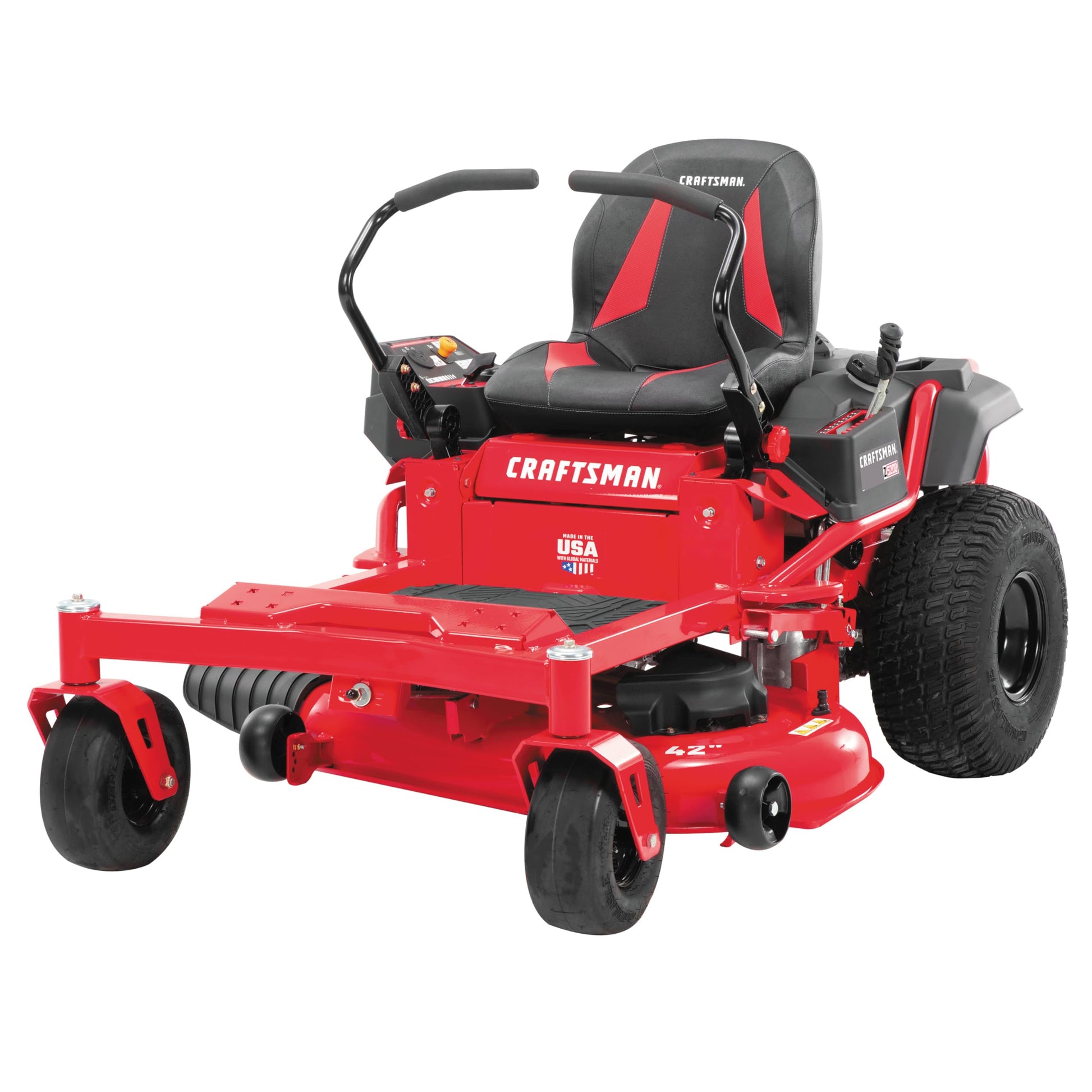 Details: Take charge of your yard with Craftsman's 42" 20.0 HP* Gas Zero-Turn Riding Mower. This gas lawn mower provides the optimized power and performance that reduces the amount of time and labor needed to maintain the beauty of your yard. It's powered by a reliable stout 20 HP* Kohler® 7000 series engine that delivers a consistent, top-quality cut whether the grass is wet or dry. Constructed with a durable 42" stamped steel deck, robust steel frame, and dual hydrostatic transmission, this gas riding lawn mower cuts up to 2 acres of grass, and the optional mulching kit helps return nutrients to your soil for a healthier lawn. The unique twin-cylinder design ensures a quick and efficient start up each time whether you're mowing in hot or cold temperatures, and the 20x8 Turf Master tires deliver an excellent grip for increased traction control. Ergonomically designed, the gas mower features 3 easily adjustable lap bar positions for customized seating and a specially designed high-back seat for a comfortable ride every time.